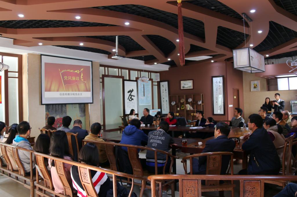 党风廉政建设是加强“三严三实”,落实“两学一做”的具体内容,为让十八届六中全会从严治党的精神贯彻到实处,信息与传媒分院党总支2016年12月10日在大益茶社召开全体党员大会,组织观看《永远在路上》专题片,并就信息与传媒分院党组织中存在的现象进行了分析和座谈。
