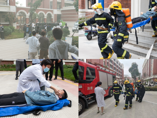 首先在演练指示下达后由专人负责发出警示信号(模拟已发生火灾)。消防人员接到报警后及时赶赴火灾现场,组织人员疏散,扑救初起火灾并组织开展灭火工作。学生们在消防员以及辅导员的引领下有序撤离至安全区域,受伤人员也被及时营救至安全区域接受救治。