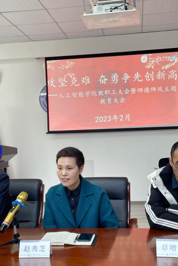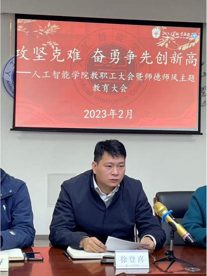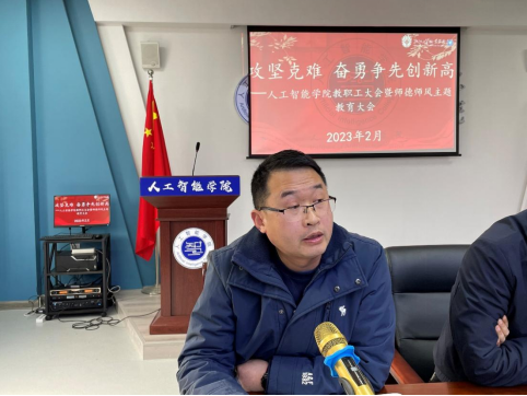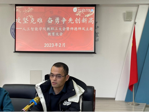 为贯彻落实学校“创新提质”主题年任务,扎实推进省“双高”、省党建工作标杆院系、职教本科等建设任务,2月24日下午,人工智能学院在414会议室召开2023年春季学期教职工大会暨师德师风主题教育大会,会议由学院副书记洪长存主持,学院全体教职工参加。