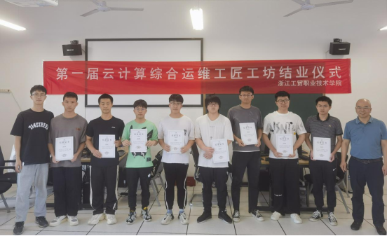 为贯彻落实《职业教育产教融合赋能提升行动实施方案(2023—2025年)》、《国家职业教育改革实施方案》等文件精神,人工智能学院紧密结合数字技术变革和产业升级需要,进一步深化产教融合、校企合作,瞄准数字化职业场景,以软件技术专业为第一期开设了云计算综合运维工匠工坊班,为大力弘扬工匠精神,提高学生技能,推进“岗课赛证融通”教学与改革,助力现场工程师培养。2023年6月28日上午,第一期云计算综合运维工匠工坊班结业仪式在人工智能学院举行。浙江工贸职业技术学院副校长汪焰、人工智能学院副院长赵秀芝、章增优、云计算驻场工程师蔡文亮和工匠工坊班的指导老师和全体学员参与了本次结业典礼,结业典礼由软件技术专业主任金慧峰主持。