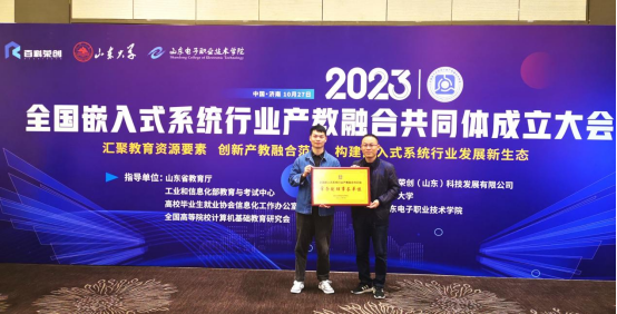 2023年10月27日,由百科荣创(山东)科技发展有限公司、山东大学、山东电子职业技术学院牵头,联合嵌入式系统行业组织、学校、科研机构、上下游企业等共同组建的全国嵌入式系统行业产教融合共同体(以下简称共同体)成立大会在泉城济南成功举行,来自全国各地的300余名共同体建设单位代表参加了会议。会前,全体与会单位完成了共同体章程审议,进行了第一届理事大会表决,我校成功当选为常务副理事长单位,余威明老师与周培老师作为我校代表在产教融合共同体成立大会上授予了常务副理事长单位证书。