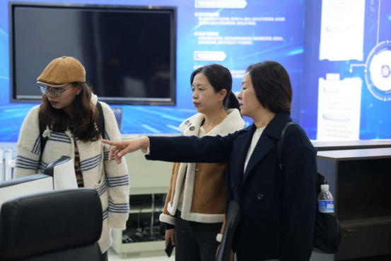 交流会前,在我院计算机应用技术专业徐欣欣老师的引导下,杜英俊副院长一行全面参观了学院展厅,详细了解了学院在人才培养、科研创新、产教融合、服务地方经济等方面的发展成果,每一项成果都引发交流团成员的细致询问。参观过程中,詹小英、李敏两位专业带头人针对“校企合作项目中的学生实践分配”等细节,与我院教师展开即时研讨,现场交流氛围热烈。