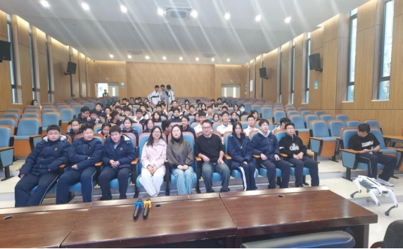 随后的实践环节,王凯老师和符洪姿老师先将机器狗放在展示区,向围拢过来的学生介绍:“这只机器狗的所有动作,都是通过软件编程实现的,它的大脑里存储着我们编写的控制程序,大家现在看到的前进、转弯、跳跃,背后都是代码在指挥。” 随后,符洪姿老师操作连接机器狗的平板,现场演示。随着手指在屏幕上点击指令,机器狗先是平稳前进,接着灵活转弯,还完成了上台阶等动作,引得学生们发出阵阵惊呼。
