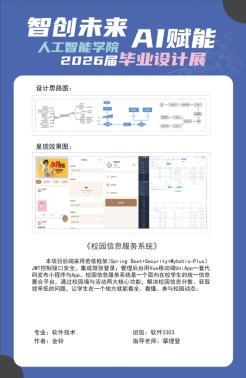 2026年1月7日,人工智能学院软件专业毕业设计展于万洋产业园圆满举办。本次展会以“智创未来,AI赋能”为核心主题,深入践行学校“产教融合、服务地方”的办学理念,以毕业设计成果集中展示为重要载体,全方位、立体化呈现软件技术专业在人才培养、技术创新与社会服务方面的扎实成效与显著质量。
