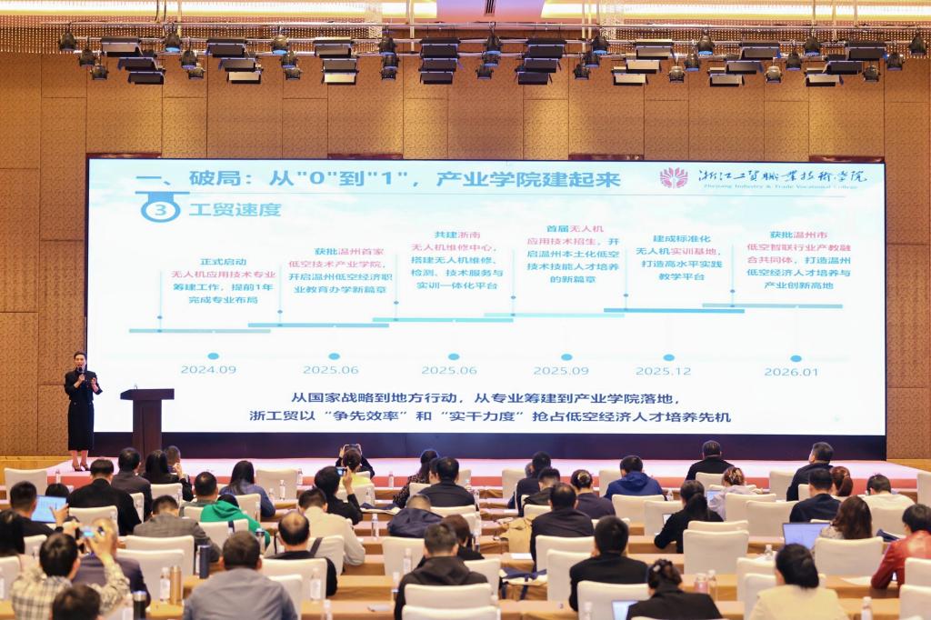 我校作为首批实践单位之一参会,人工智能学院院长赵秀芝在会上作了题为《从“0 到 1”到“1 到 N”:建设温州低空技术产业学院赋能区域经济高质量发展》的专题汇报,系统阐述了学院筹建温州低空技术产业学院以及在产教融合方面的创新探索与实践成效,汇报逻辑清晰、案例生动,引发与会代表热烈反响。